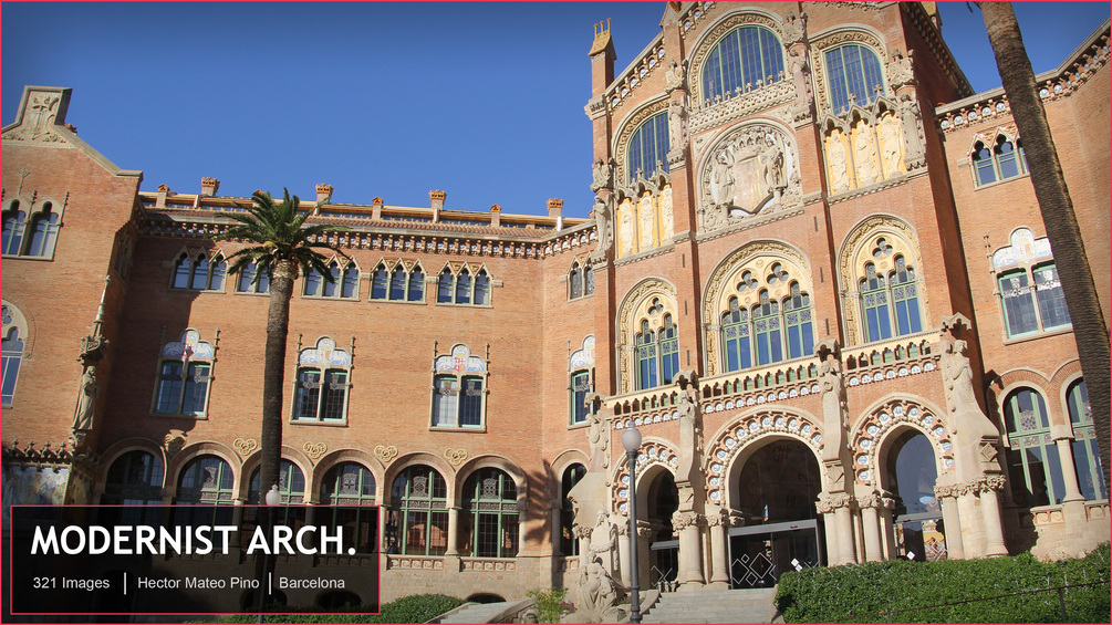 It offers an insight into the Modernism Architecture movement within Barcelona, featuring UNESCO world heritage buildings. It features primarily the Hospital de Sant Pau, both exterior and interior of the whole area with closeup details. It also contains images of the Sagrada Familia's facade, as well as iconic buildings from Passeig de Gracia.